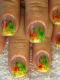 Цветочные и фруктовые мотивы рисунков на пике моды. Изменяя размер и расположение элементов росписи можно каждый раз создавать новые произведения маникюрного искусства.